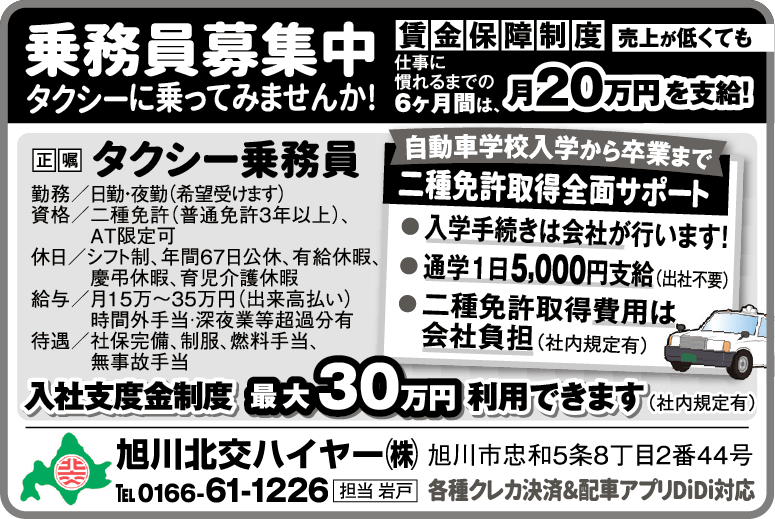 旭川北交ハイヤー㈱ ホーム 雇用形態で探す(正社員・正職員) 旭川北交ハイヤー㈱ 職種 タクシー乗務員正社員嘱託職員 要資格 制服・用具貸与 産前産後・育児・介護休暇 要自動車免許 公開日:2025年10月14日 掲載期間:2025年10月21日まで 労働者募集に関する情報提供日時:2025年10月10日時点 キープ この求人への応募はこちら ご応募またはお問合せ先の表示 0166611226 ※お電話の際は「ライナージョブを見て」とお伝え下さい。
