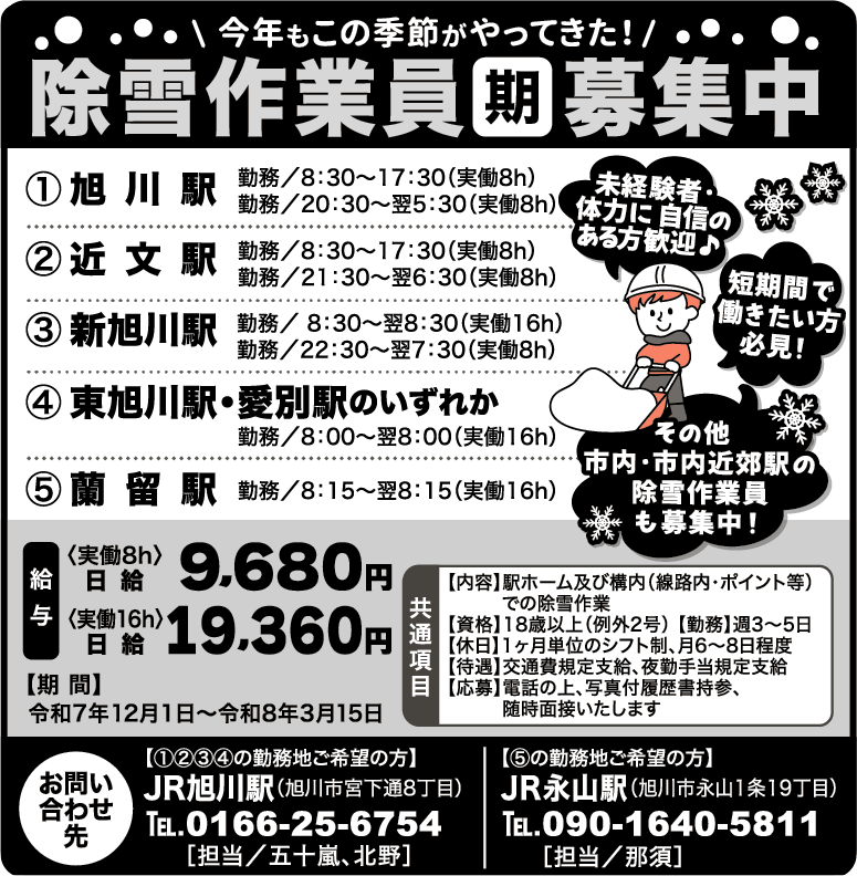 JR旭川駅・JR永山駅 ホーム 雇用形態で探す(パート・アルバイト) JR旭川駅・JR永山駅 職種 除雪作業員期間社員 交通費支給 未経験・初心者歓迎 短期勤務 公開日:2025年10月21日 掲載期間:2025年10月28日まで 労働者募集に関する情報提供日時:2025年10月20日時点 キープ この求人への応募はこちら 掲載内容の電話番号および受付時間をご確認の上お問い合わせください。