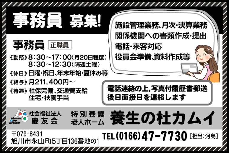 社会福祉法人慶友会 特別養護老人ホーム養生の杜カムイ ホーム 雇用形態で探す(正社員・正職員) 社会福祉法人慶友会 特別養護老人ホーム養生の杜カムイ 職種 事務員正社員 交通費支給 公開日:2025年10月28日 掲載期間:2025年11月4日まで 労働者募集に関する情報提供日時:2025年10月27日時点 キープ この求人への応募はこちら ご応募またはお問合せ先の表示 0166477730 ※お電話の際は「ライナージョブを見て」とお伝え下さい。