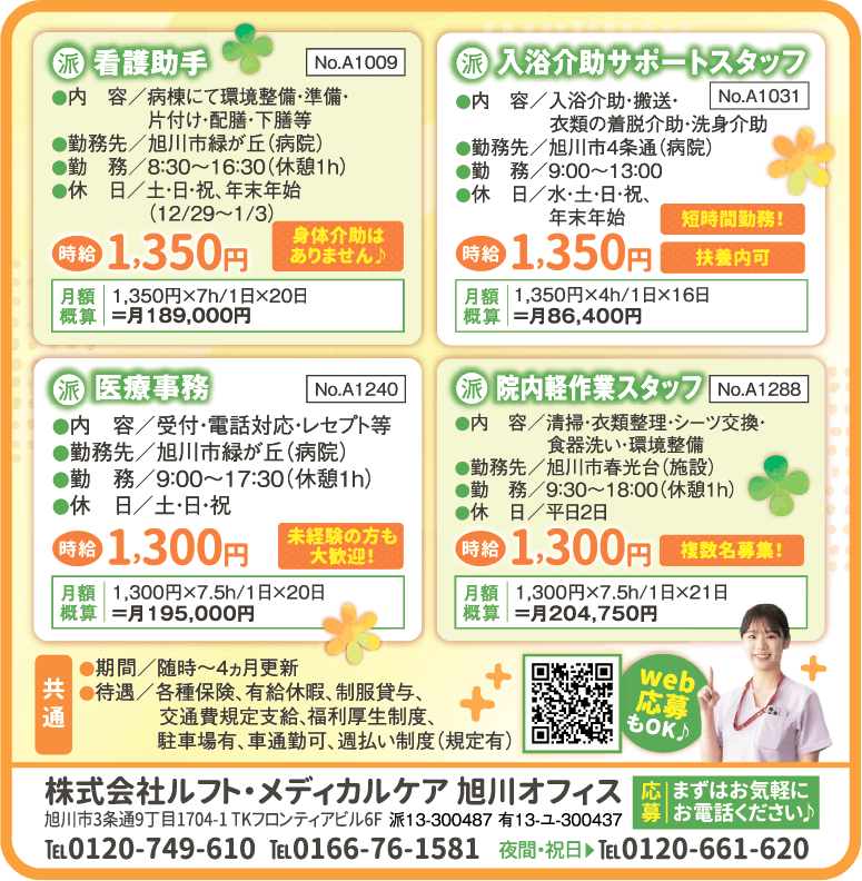 | 職種 | 看護助手 派遣 入浴介助サポートスタッフ 派遣 医療事務 派遣 院内軽作業スタッフ 派遣 |
