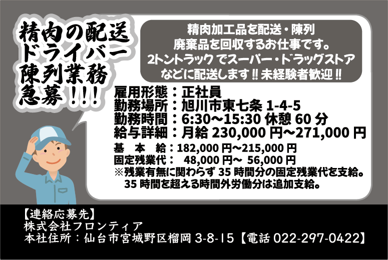 探している求人と似ている求人 掲載終了日:11月4日迄 タクシー乗務員正社員 旭川中央交通株式会社 旭川市内 / 東光・豊岡 / 春光・末広 月給18万円以上 キープ 詳細 GOOD JOB 掲載終了日:11月4日迄 清掃スタッフ派遣新工場での野菜の皮むき派遣座ってできる軽作業派遣工場での型枠に砂を詰める作業派遣 他 ㈱シグマスタッフ旭川支店 旭川市内 / 中心部 / 東光・豊岡 / 春光・末広 / 新旭川・永山 / 神楽・神居 / 旭川近郊 / 東川町 / 当麻町 / 愛別町 / 士別市 時給1075円以上 キープ 詳細 掲載終了日:11月7日迄 施設用務員パート運転手パート 社会福祉法人慶友会 特別養護老人ホーム養生の杜カムイ 旭川市内 / 新旭川・永山 時給1075円以上 キープ 詳細 掲載終了日:11月4日迄 作業療法士正社員理学療法士正社員 重度障がい児支援 花色 旭川市内 / 春光・末広 月給20万円以上 キープ 詳細