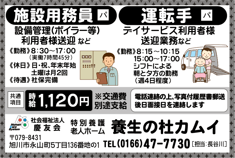 社会福祉法人慶友会 特別養護老人ホーム養生の杜カムイ ホーム 雇用形態で探す(パート・アルバイト) 社会福祉法人慶友会 特別養護老人ホーム養生の杜カムイ 職種 施設用務員パート運転手パート 交通費支給 公開日:2025年10月31日 掲載期間:2025年11月7日まで 労働者募集に関する情報提供日時:2025年10月29日時点 キープ この求人への応募はこちら ご応募またはお問合せ先の表示 0166477730 ※お電話の際は「ライナージョブを見て」とお伝え下さい。