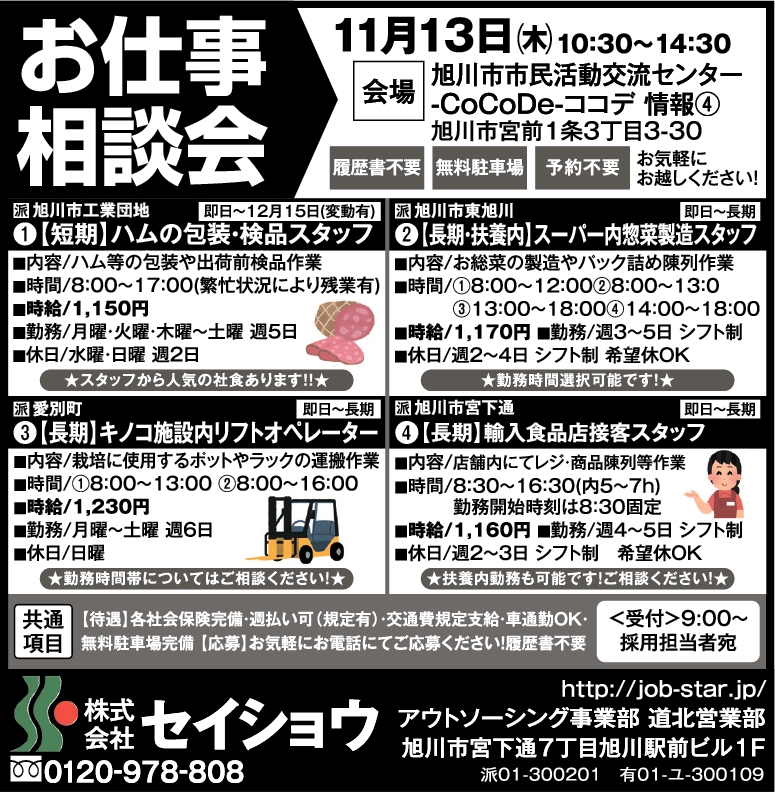 ハムの包装・検品スタッフ[派]スーパー内惣菜製造スタッフ[派]キノコ施設内リフトオペレーター[派]輸入食品店接客スタッフ[派]