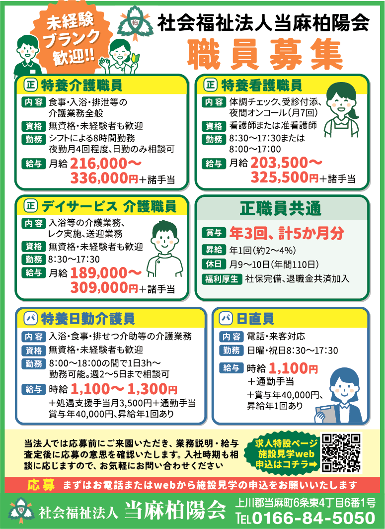 | 職種 | 特養介護職員 正社員 特養看護職員 パート デイサービス介護職員 正社員 特養日勤介護員 パート 日直員 パート |
