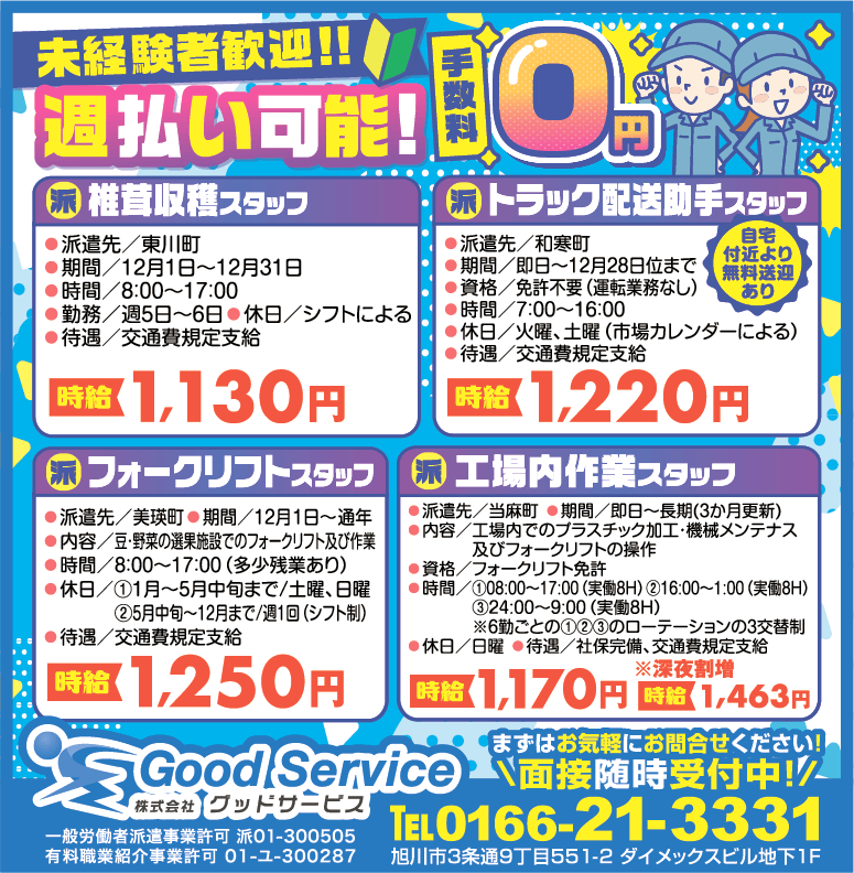 | 職種 | 椎茸収穫スタッフ 派遣 トラック配送助手スタッフ 派遣 フォークリフトスタッフ 派遣 工場内作業スタッフ 派遣 |