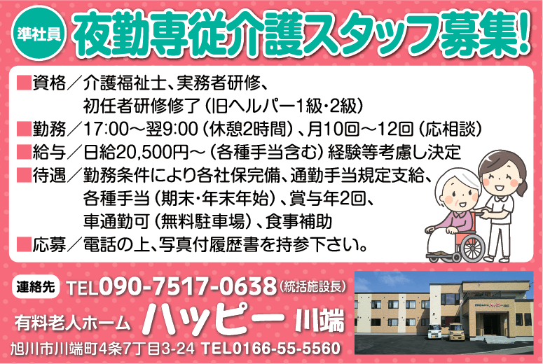 探している求人と似ている求人 掲載終了日:11月28日迄 世話人パート グループホーム 太陽の光 旭川市内 / 春光・末広 時給1075円以上 キープ 詳細 PICK UP 掲載終了日:12月2日迄 あなたの笑顔と優しさが皆さんの支えになる 介護員正社員パート看護師正社員パート 合同会社きぼう 有料老人ホームうらら・有料老人ホーム セラヴィ豊岡 旭川市内 / 東光・豊岡 / 春光・末広 時給1200円以上 / 月給20万円以上 キープ 詳細 掲載終了日:12月2日迄 夜勤専門介護員パート 養護盲人老人ホーム 旭光園 旭川市内 / 中心部 日給15000円以上 キープ 詳細 掲載終了日:12月2日迄 正・准看護師パート 有料老親ホームハート末広 旭川市内 / 春光・末広 時給1200円以上 キープ 詳細