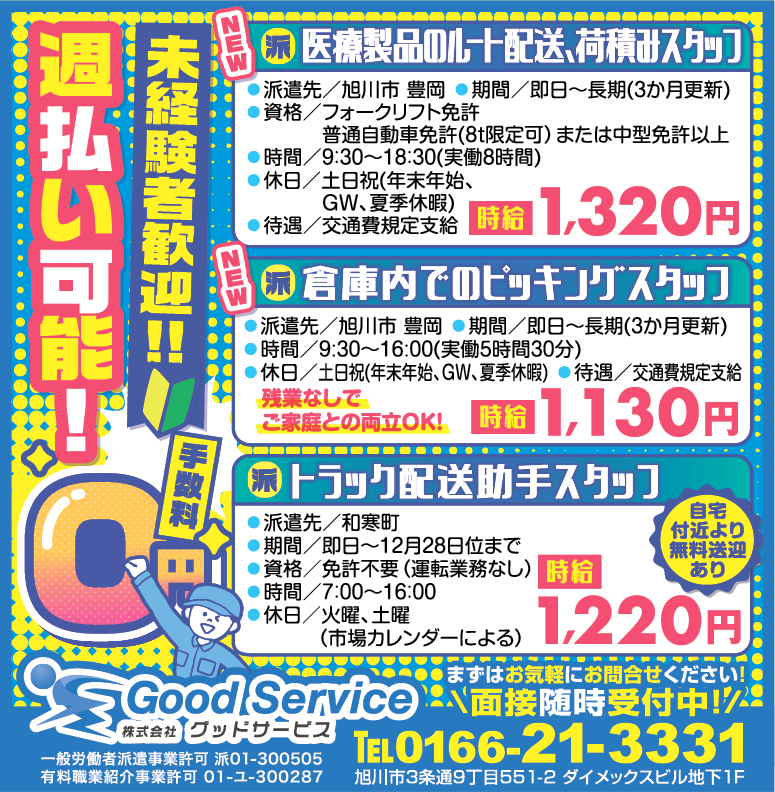 | 職種 | 医療製品のルート配送・荷積みスタッフ 派遣 倉庫内でのピッキングスタッフ 派遣 トラック配送助手スタッフ 派遣 |