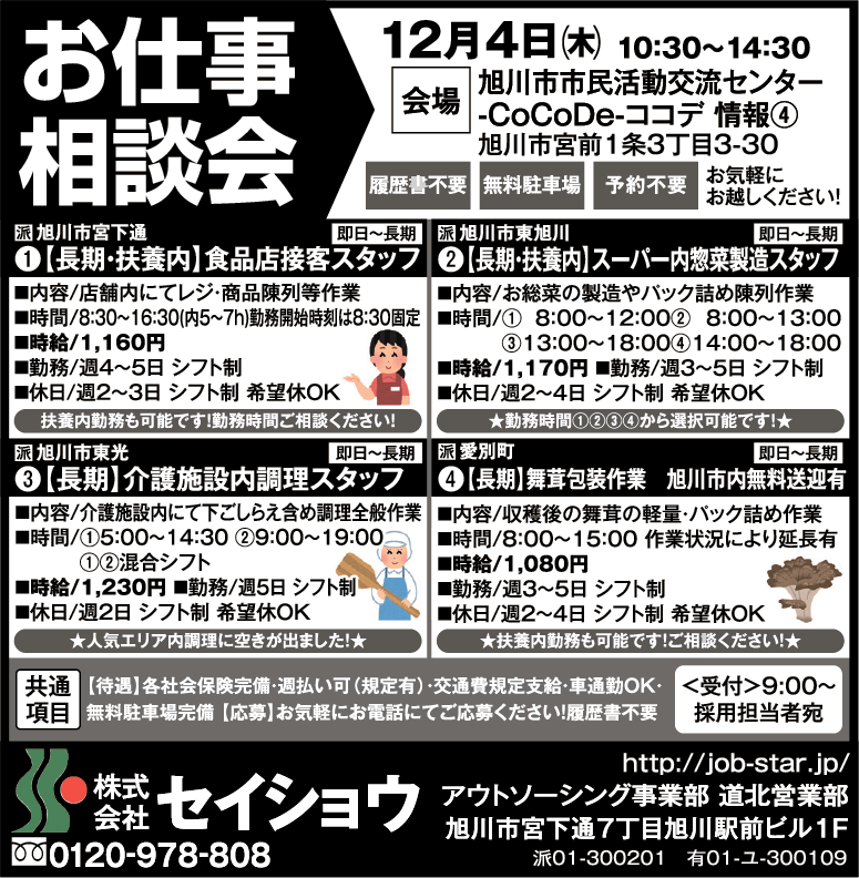 食品店接客スタッフ[派]スーパー内惣菜製造スタッフ[派]介護施設内調理スタッフ[派]舞茸包装作業[派]