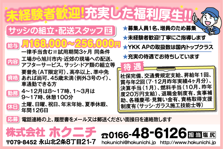 | 職種 | サッシの組立・配送スタッフ 正社員 |