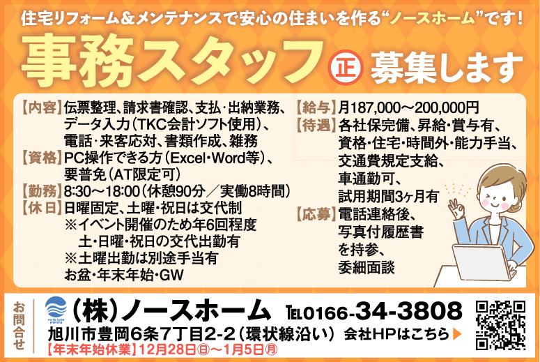 | 応募 | 電話連絡後、写真付履歴書を持参、 委細面談 【年末年始休業】12月28日㊐~1月5日㊊ |