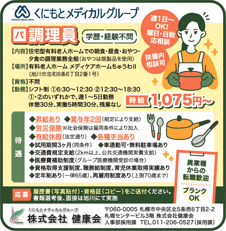 | 応募 | 履歴書(写真貼付)・資格証(コピー)をご送付ください。 書類選考後、面接は旭川にて実施 【送付先】 〒060-0005 札幌市中央区北5条西6丁目2-2 札幌センタービル3階 株式会社健康会 人事部採用課 |