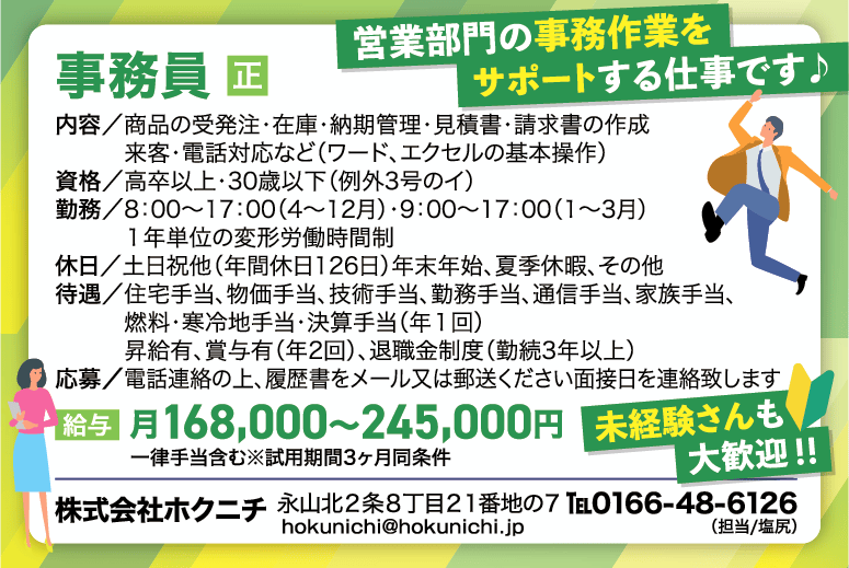 | 内容 | 商品の受発注・在庫・納期管理・見積書・請求書の作成 来客・電話対応など(ワード、エクセルの基本操作) |