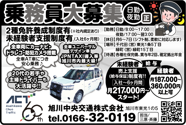 | その他・PR | 日勤・夜勤乗務員大募集 全車両にカーナビ・ ドラレコ・防犯カメラ搭載 全車AT車につき安心乗務♪ 全車ユニバーサルデザイン車 JPNTAXI導入率 旭川市内最大級! 20代の若手や 主婦ドライバーも大活躍中!! |