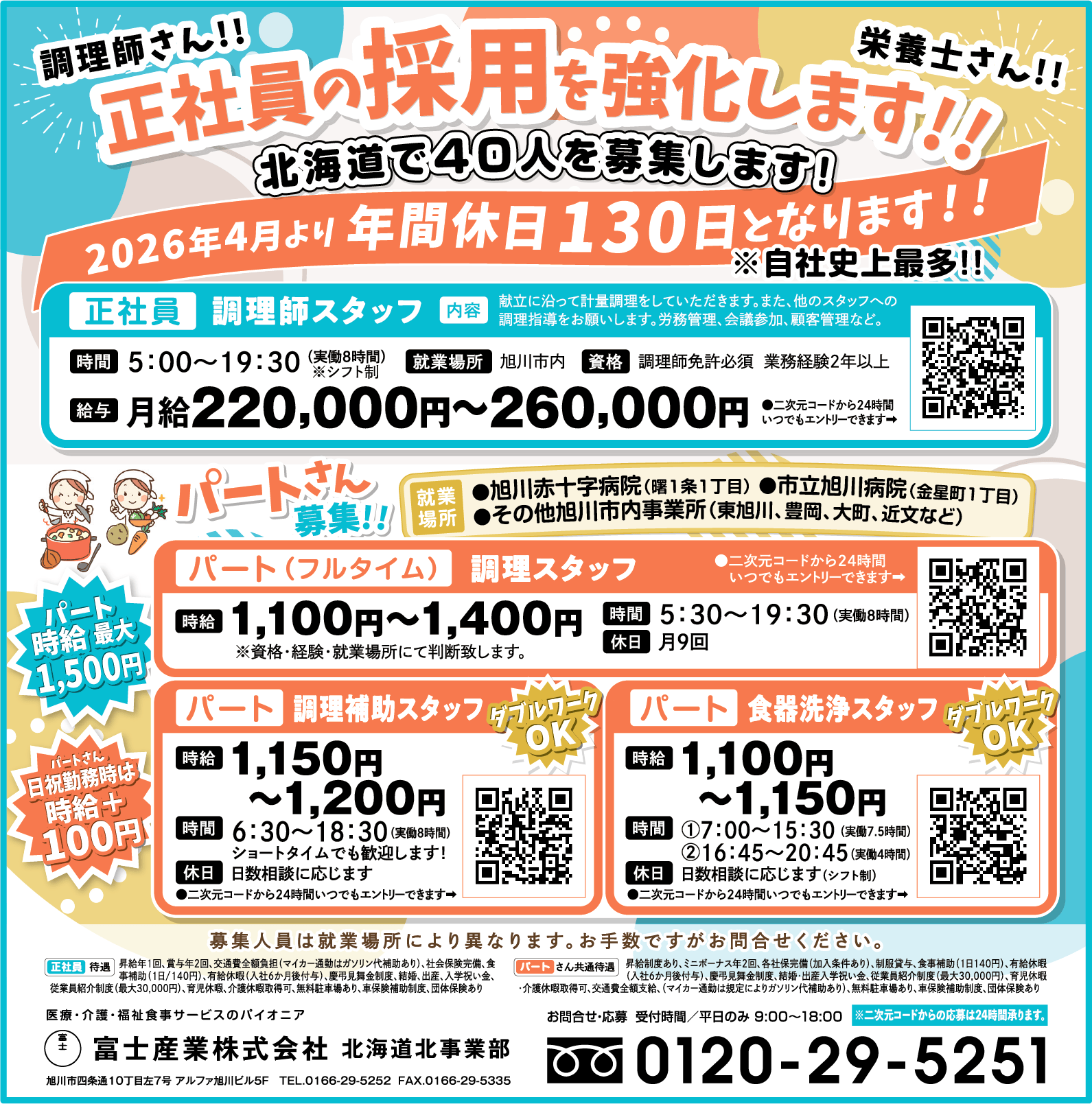 | その他・PR | 調理師さん!!栄養士さん!! 正社員の採用を強化します!! 北海道で40人を募集します! 募集人員は就業場所により異なります。お手数ですがお問合せください。 |