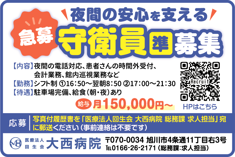 | 応募 | 写真付履歴書を「〒070-0034 旭川市4条通11丁目右3号 医療法人回生会 大西病院 総務課 求人担当」宛に郵送ください(事前連絡は不要です) |