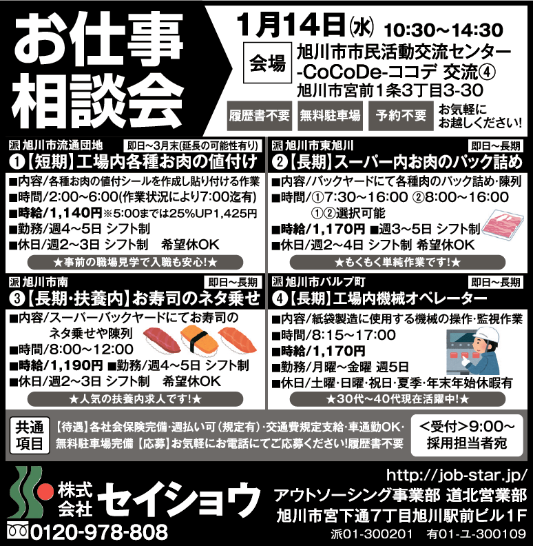 | その他・PR | ★もくもく単純作業です! お仕事相談会 1月14日(水)10:30~14:30 旭川市市民活動交流センター -CoCoDe-ココデ 交流④ (旭川市宮前1条3丁目3-30) 履歴書不要 無料駐車場 予約不要 お気軽にお越しください! |