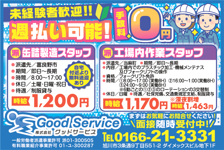| 事業内容 | 人材派遣業 一般労働者派遣事業許可 般01-300505 有料職業紹介事業許可 01-ユ-300287 |