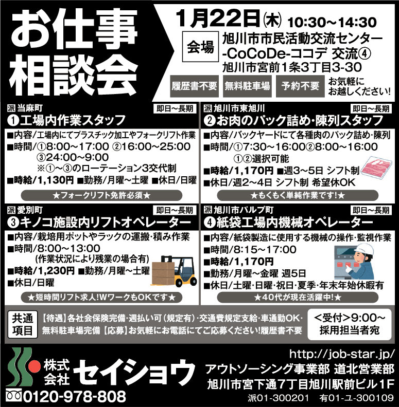 | その他・PR | ★短時間リフト求人!WワークもOKです お仕事相談会 1月22日(木)10:30~14:30 旭川市市民活動交流センター -CoCoDe-ココデ 交流④ (旭川市宮前1条3丁目3-30) 履歴書不要 無料駐車場 予約不要 お気軽にお越しください! |
