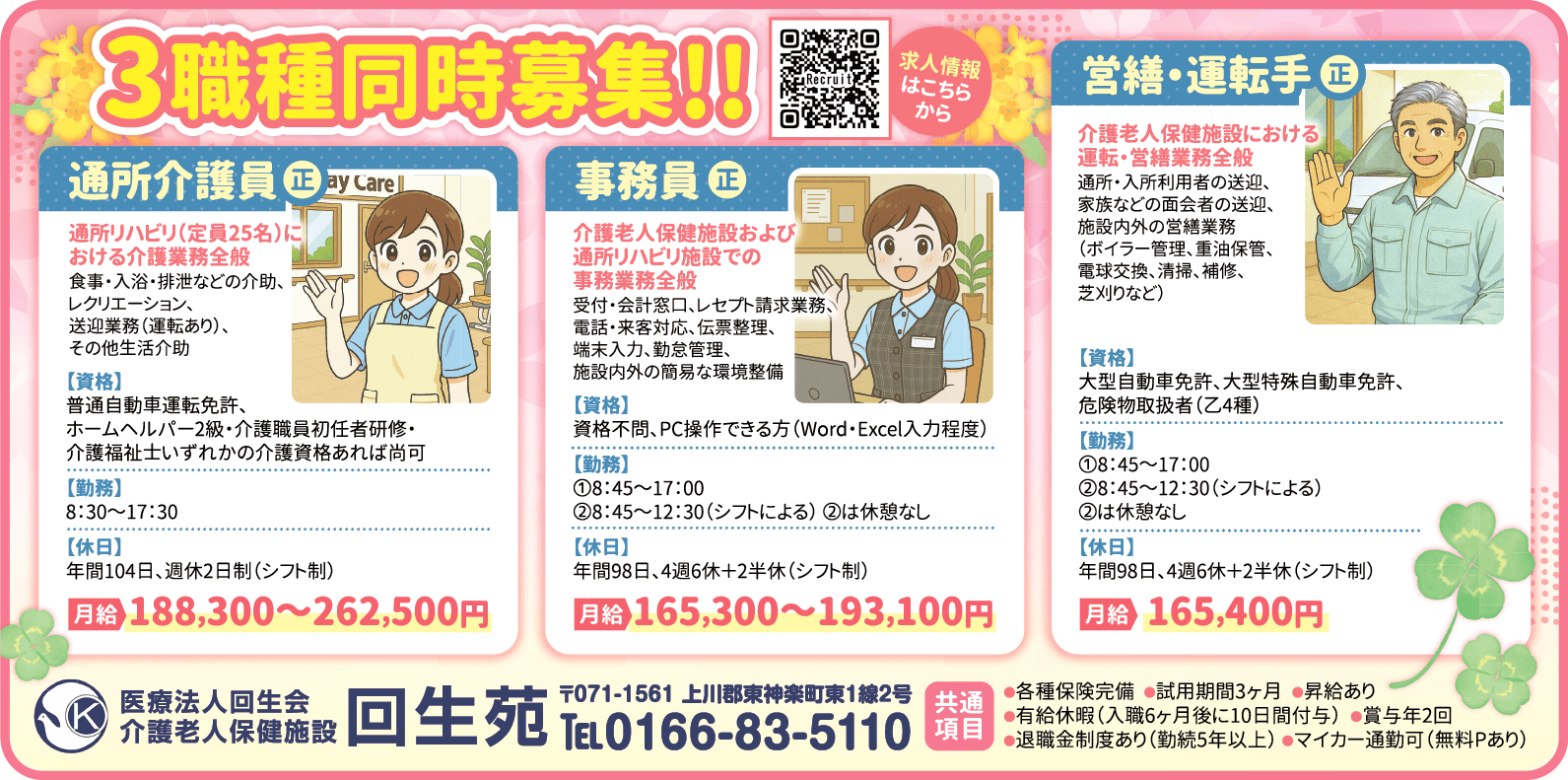 | 待遇 | ●各種保険完備●試用期間3ヶ月●昇給あり ●有給休暇(入職6ヶ月後に10日間付与)●賞与年2回 ●退職金制度あり(勤続5年以上)●マイカー通勤可(無料Pあり) |