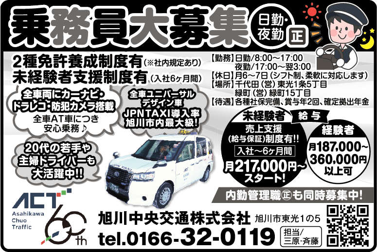 | その他・PR | 日勤・夜勤乗務員大募集 全車両にカーナビ・ ドラレコ・防犯カメラ搭載 全車AT車につき安心乗務♪ 全車ユニバーサルデザイン車 JPNTAXI導入率 旭川市内最大級! 20代の若手や 主婦ドライバーも大活躍中!! 内勤管理職[正]も同時募集中! |