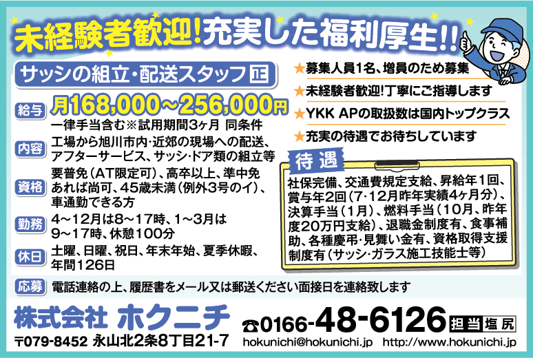 | 内容 | 工場から旭川市内・近郊の現場への配送、 アフターサービス、サッシ・ドア類の組立等 |