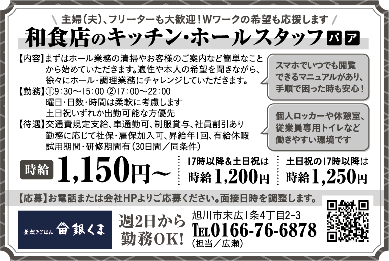 | 職種 | 和食店のキッチン・ホールスタッフ パート アルバイト |