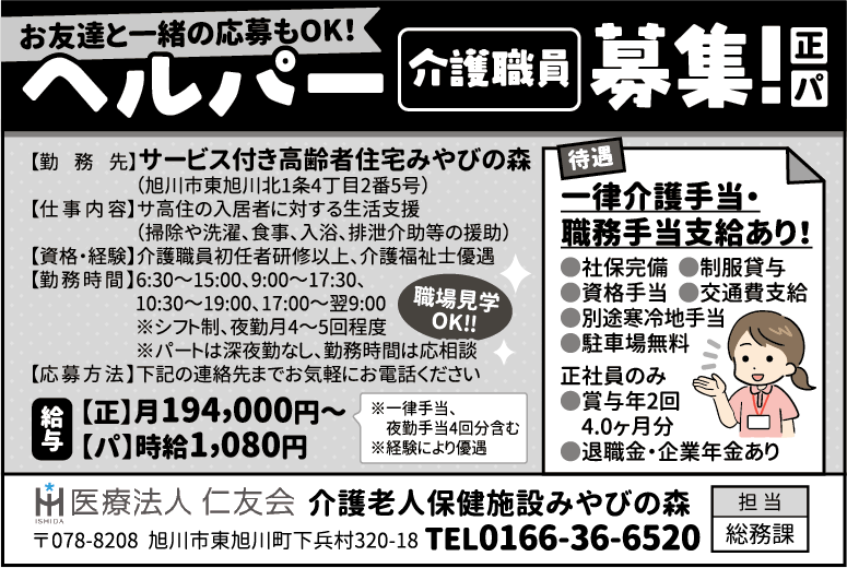 | 応募 | 下記の連絡先までお気軽にお電話ください 介護老人保健施設みやびの森 〒078-8208 旭川市東旭川町下兵村320-18 ℡0166-36-6520 担当/総務課 |