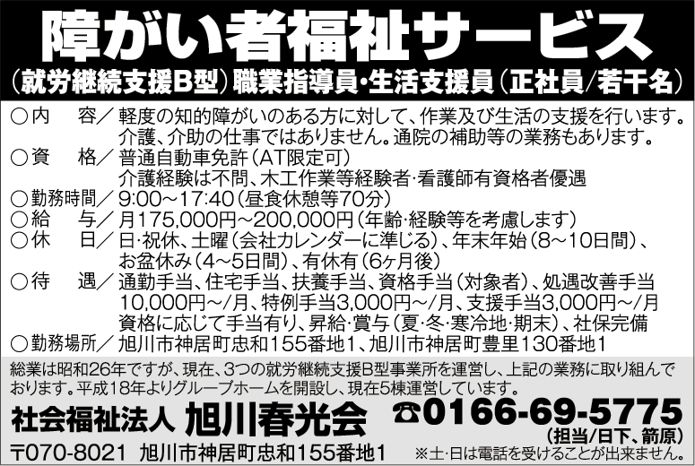 | 内容 | 軽度の知的障がいのある方に対して、作業及び生活の支援を行います。 介護、介助の仕事ではありません。通院の補助等の業務もあります。 |