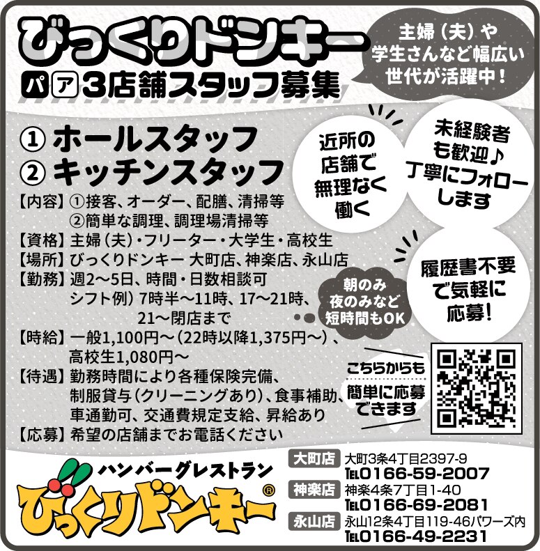 | その他・PR | びっくりドンキー3店舗スタッフ募集 主婦(夫).や学生さんなど幅広い世代が活躍中! 近所の店舗で無理なく働く 未経験者も歓迎♪丁寧にフォローします 朝のみ夜のみなど短時間もOK 履歴晝不要で気軽に応募! |