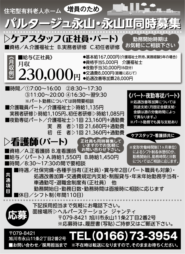 | 所在地 | 住宅型有料老人ホーム パルタージュ永山 旭川市永山7条1-3-8 住宅型有料老人ホームパルタージュ永山|| 旭川市永山十一条2-1-21 |