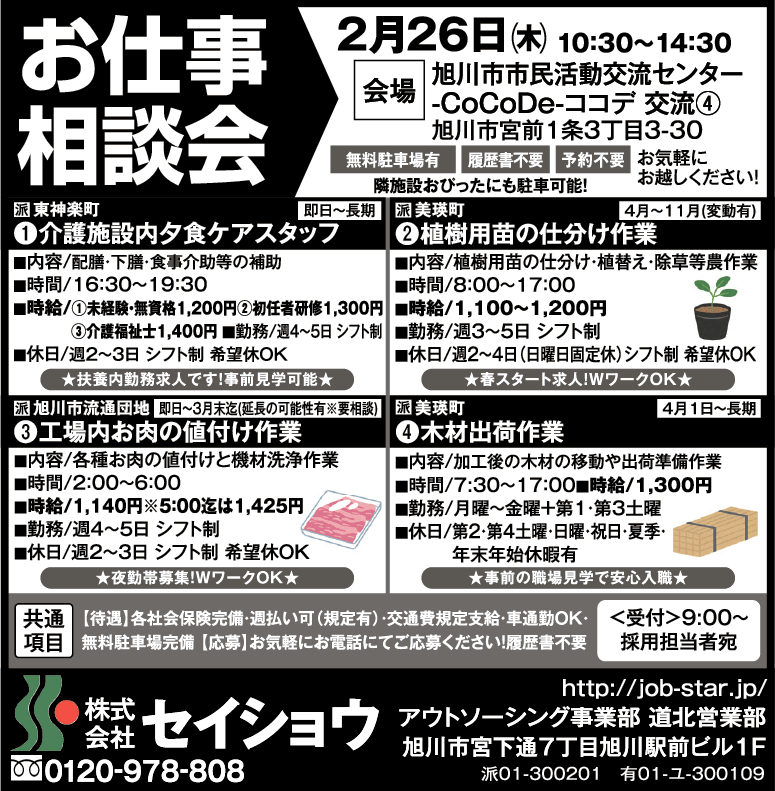 | その他・PR | ★春スタート求人!WワークOK★ お仕事相談会 2月26日(木)10:30~14:30 旭川市市民活動交流センター -CoCoDe-ココデ 交流④ (旭川市宮前1条3丁目3-30) 履歴書不要 無料駐車場 予約不要 お気軽にお越しください! 隣施設おぴったにも駐車可能! |