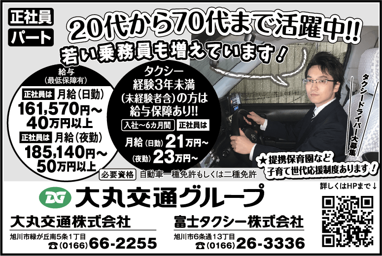 | 場所 | 大丸交通株式会社 旭川市緑が丘南5条1丁目 富士タクシー株式会社 旭川市6条通13丁目 |