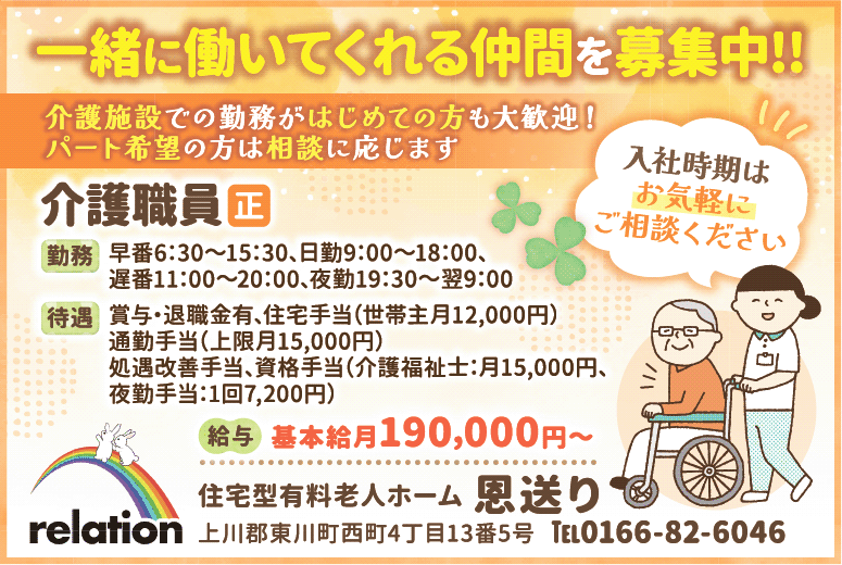 | 事業内容 | 住宅型有料老人ホーム 恩送り 上川郡東川町西町4丁目13番5号 TEL0166-82-6046 |