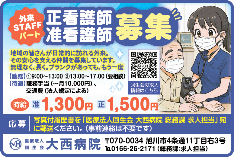 | 応募 | 写真付履歴書を以下宛に郵送ください。(事前連絡は不要です) 医療法人回生会 大西病院 〒070-0034 旭川市4条通11丁目右3号(総務課:求人担当) |