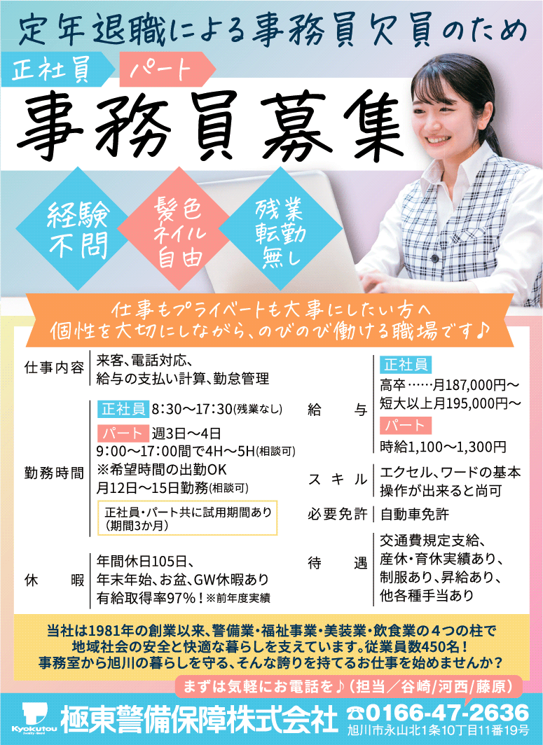 | その他・PR | 定年退職による事務員欠員のため 正社員・パート事務員募集 経験不問 髪色ネイル自由 残業転勤なし 仕事もプライベートも大事にしたい方へ 個性を大切にしながら、のびのび働ける職場です♪ 社は1981年の創業以来、備業・福祉事業・美装業・飲食業の4つの柱で地域社会の安全と快適な暮らしを支えています。従業員数450名! 事務室から旭川の暮らしを守る、そんな誇りを持てるお仕事を始めませんか? |