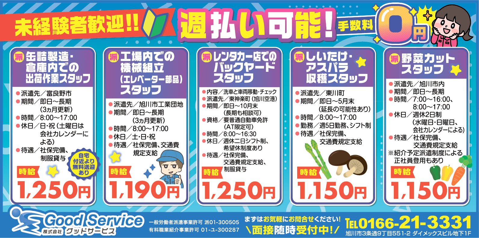 | 事業内容 | 人材派遣業 一般労働者派遣事業許可 般01-300505 有料職業紹介事業許可 01-ユ-300287 |