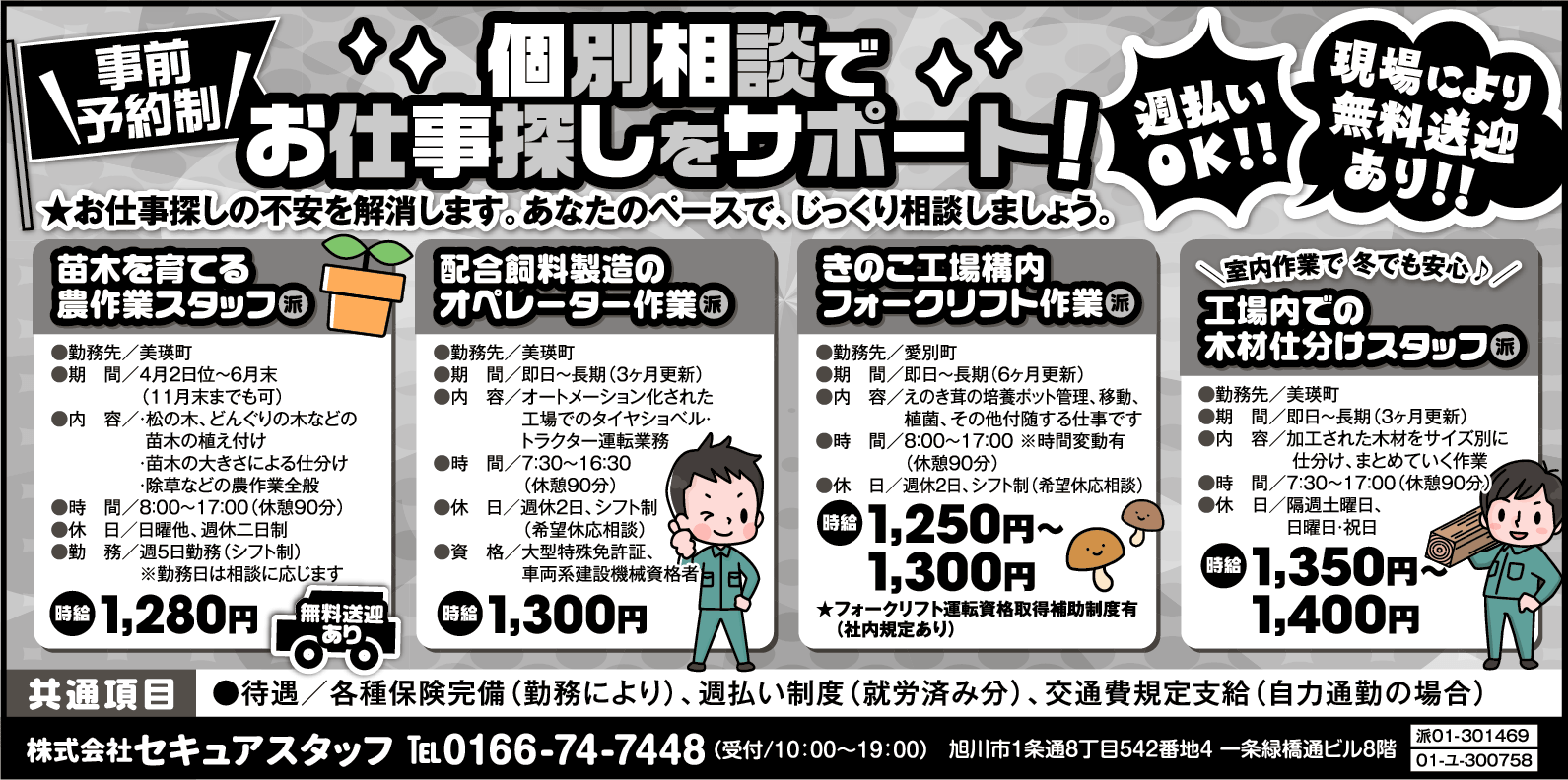 | その他・PR | 個別相談でやお仕事探しをサポート! 事前予約制 ★お仕事探しの不安を解消します。あなたのペースで、じっくり相談しましょう。 週払いOK!! 現場により無料送迎あり!! |
