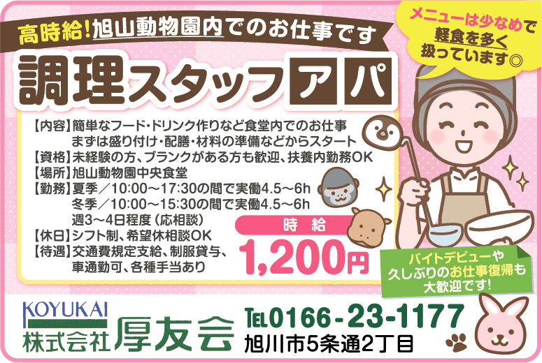 | その他・PR | 高時給!旭山動物園内でのお仕事です メニューは少なめで軽食を多く扱っています◎ バイトデビューや久しぶりのお仕事復帰も大歓迎です! |