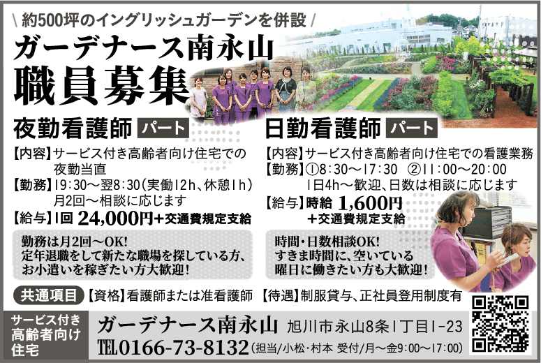 | その他・PR | \約500坪のイングリッシュガーデンを併設/ ガーデナース南永山職員募集 勤務は月2回〜OK! 定年退職をして新たな職場を探している方、 お小遣いを稼ぎたい方大歓迎! |