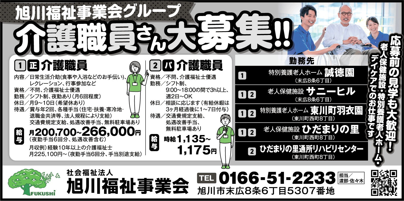 | その他・PR | 旭川福祉事業会グループ 介護職員さん大募集!! 応募前の見学も大歓迎!老人保健施設・特別養護老人ホームデイケアでのお仕事です |