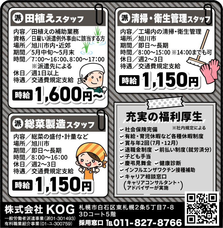 | 事業内容 | 一般労働者派遣事業(派01-301493) 有料職業紹介事業(01-ユ-300759) |