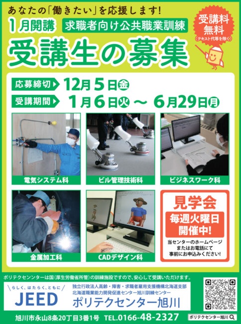 【ポリテクセンター旭川】1月開講 求職者向け公共職業訓練 受講生の募集