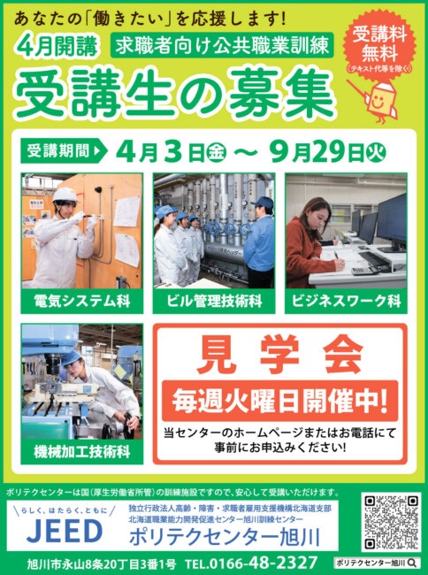 【ポリテクセンター旭川】4月開講 求職者向け公共職業訓練受講生の募集
